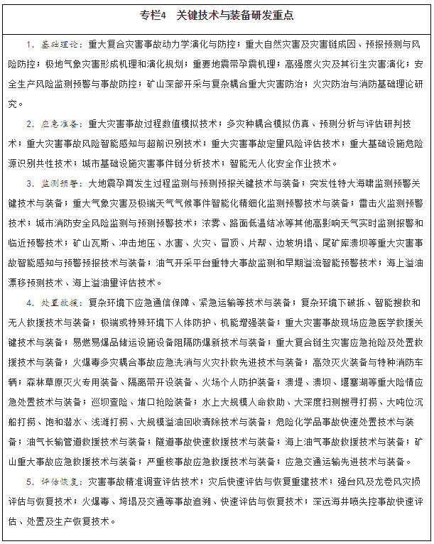 深化應(yīng)用基礎(chǔ)研究。聚焦災(zāi)害事故防控基礎(chǔ)問題,強(qiáng)化多學(xué)科交叉理論研究。開展重大自然災(zāi)害科學(xué)考察與調(diào)查。整合利用中央和地方政府、企業(yè)以及其他優(yōu)勢(shì)科技資源,加強(qiáng)自主創(chuàng)新和“卡脖子”技術(shù)攻關(guān)。實(shí)施重大災(zāi)害事故防治、重大基礎(chǔ)設(shè)施防災(zāi)風(fēng)險(xiǎn)評(píng)估等國家科技計(jì)劃項(xiàng)目,制定國家重大應(yīng)急關(guān)鍵技術(shù)攻關(guān)指南,加快主動(dòng)預(yù)防型安全技術(shù)研究。